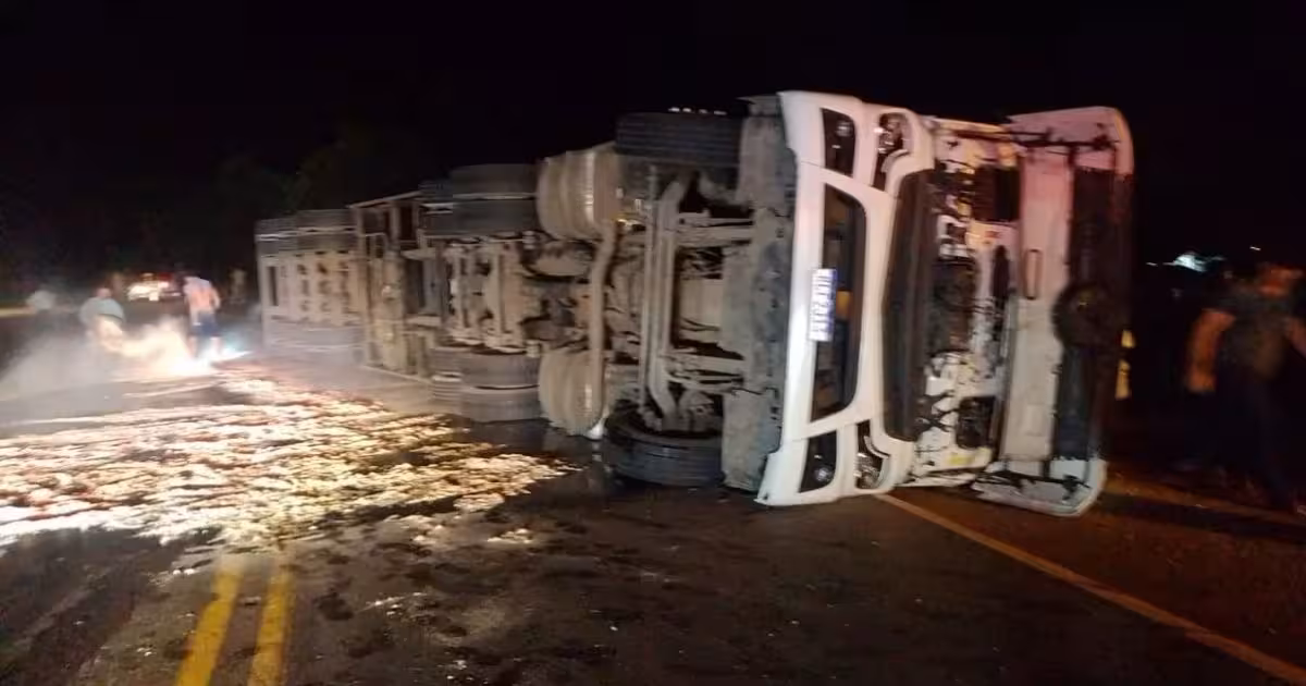De acordo com informações, a carreta tombou e caiu por cima de um Chevrolet Onix, que havia um homem, de 33 anos, e uma menina de 5 anos.