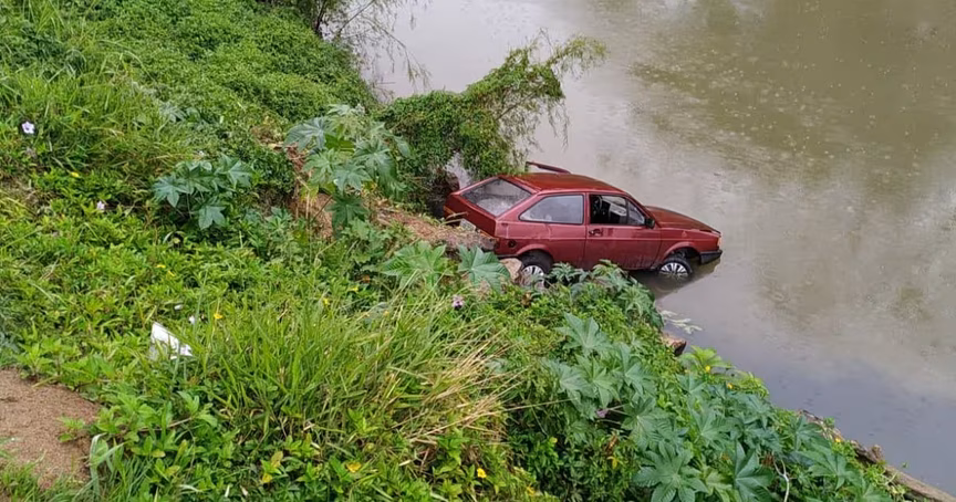O veículo desceu a ribanceira e parou às margens do rio, com a parte dianteira já dentro da água. Será necessário um guincho para retirar o carro do local.