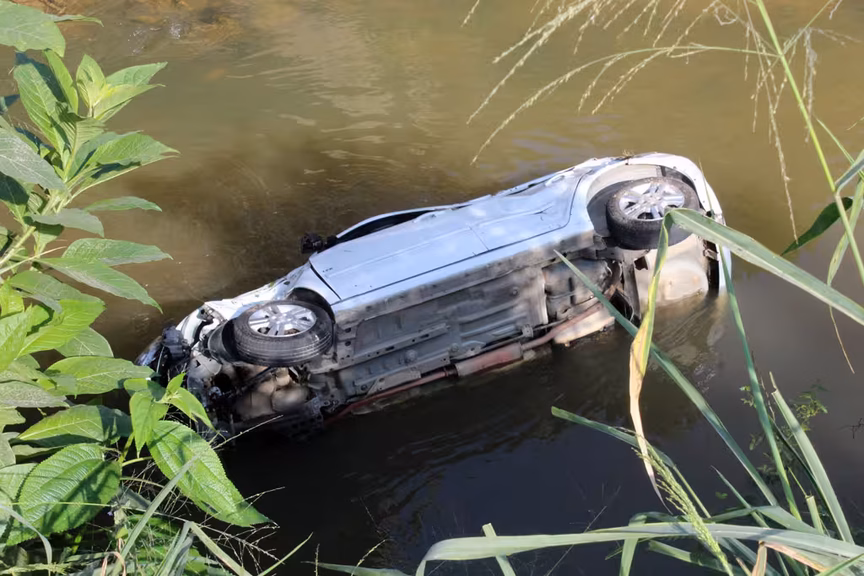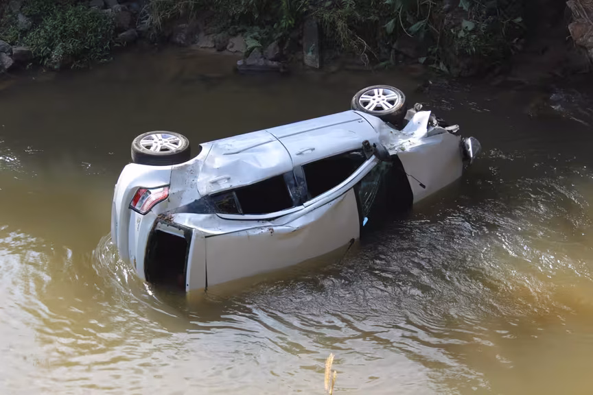 Carro cai em ribeirão com criança de 7 anos e cachorro, no bairro Guabiruba Sul