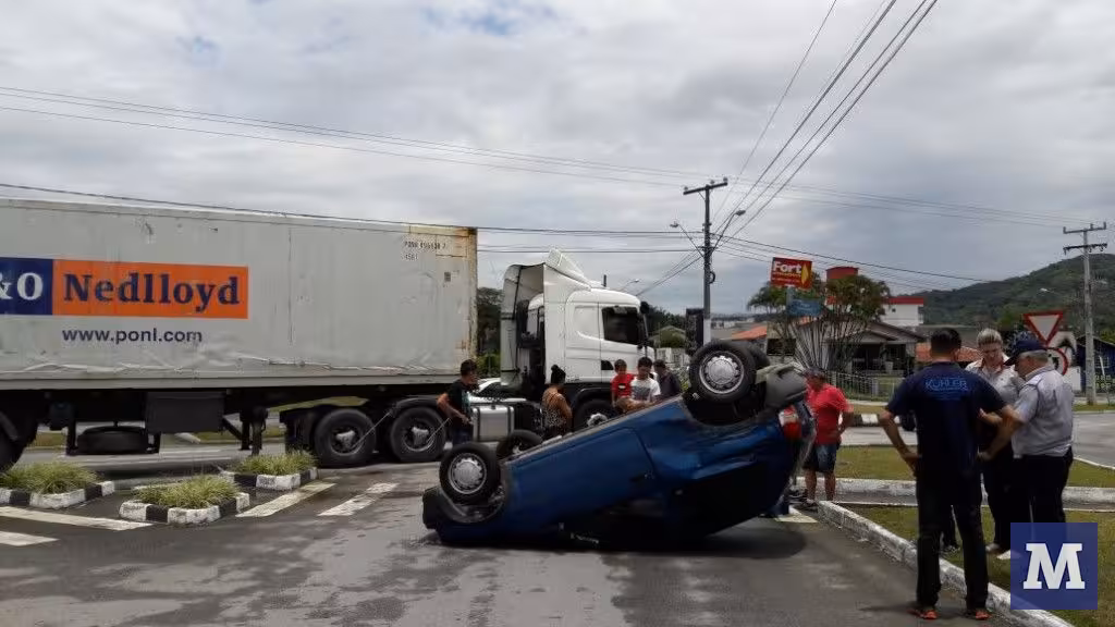 O veículo Corsa, azul, capotou por volta das 12h30 desta segunda-feira, 12, ao ser atingido por uma carreta, na rotatória da Apae, no Jardim Maluche.
