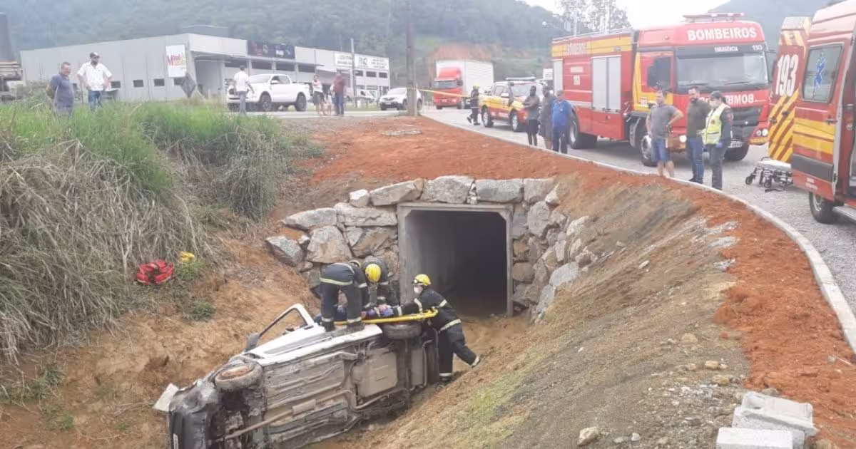 Carro capota e cai em vala na rodovia Ivo Silveira, entre Brusque e Gaspar
