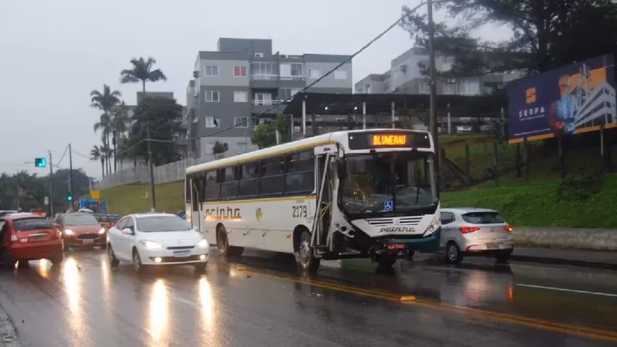 Um carro colidiu de frente com um ônibus na manhã desta quinta-feira, 14, na rua Bahia, bairro Salto Weissbach, em Blumenau. O trânsito ficou lento no local devido ao acidente.
