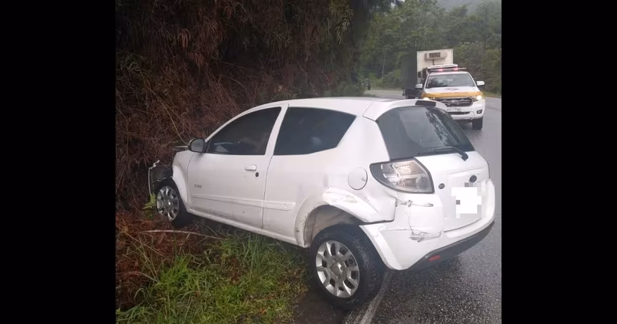 Por volta das 15h20 desta terça-feira, 4, um carro com placas de Brusque saiu da pista e bateu em um barranco na SC-108, no quilômetro 142,350, no Claraíba, em Nova Trento.