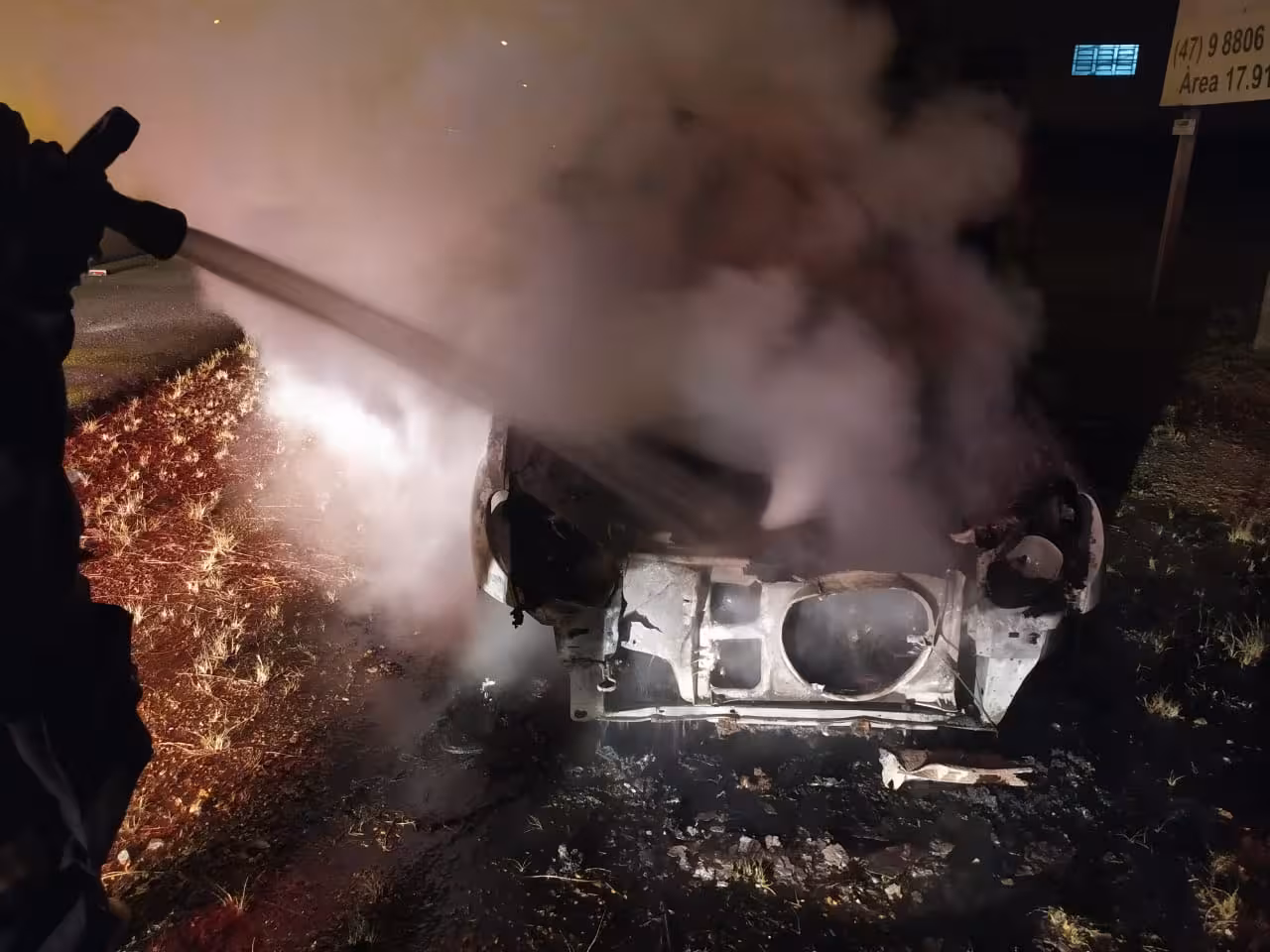 Um carro foi destruído após ser atingido por um incêndio na madrugada desta quarta-feira, 3. A ocorrência foi registrada na rodovia Antônio Heil, na altura do bairro Limoeiro.