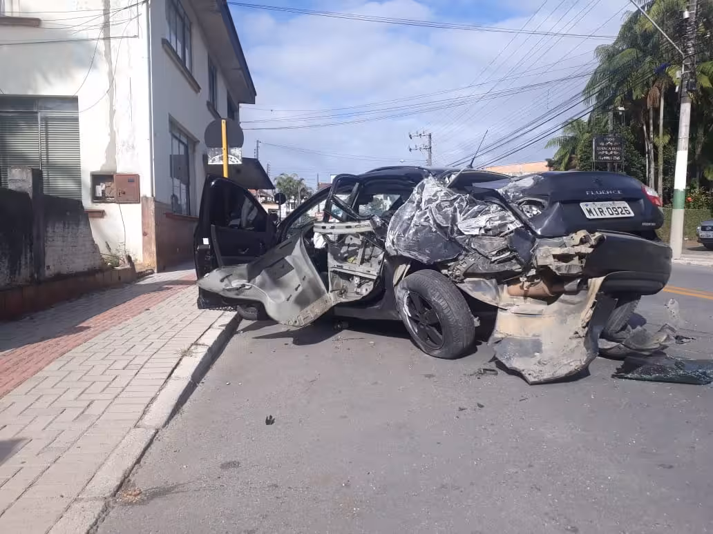 Um Renault Fluence, com placas de Jaraguá do Sul, ficou destruído após colidir contra dois postes neste domingo, 5, na rua Santos Dumont, no bairro Santa Terezinha.