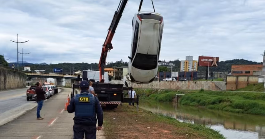Um veículo foi retirado do rio Itajaí-Mirim na tarde desta segunda-feira, 29, depois de cair durante um acidente durante a madrugada. O carro caiu no rio na altura do bairro Santa Rita.