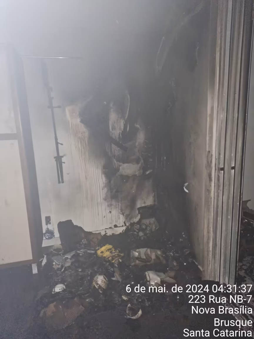 O foco do incêndio estava em uma das suítes, usada para trabalho. No quarto, havia caixas de papelão com louças embaixo de um ar-condicionado completamente danificado.