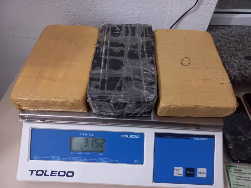 Ao fazerem buscas nas imediações, foram localizados os três volumes dispensados pelos integrantes do veículo. Eram três tabletes de cocaína, pesando aproximadamente 3.150 gramas.
