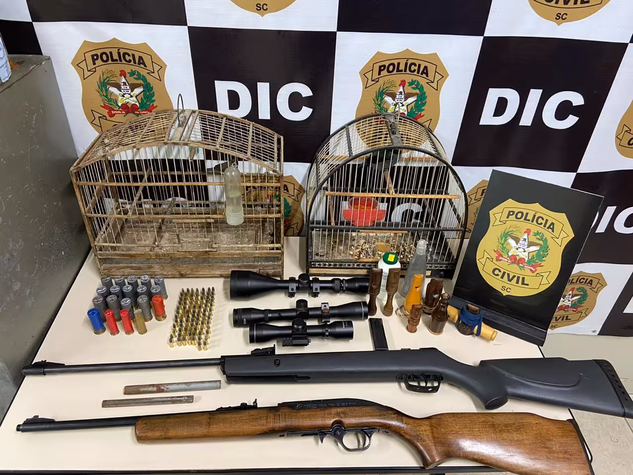 Um casal foi preso na manhã desta segunda-feira, 23, durante uma operação da Polícia Civil, em Guabiruba. No local foram apreendidos dois pássaros silvestres, armas e munições.