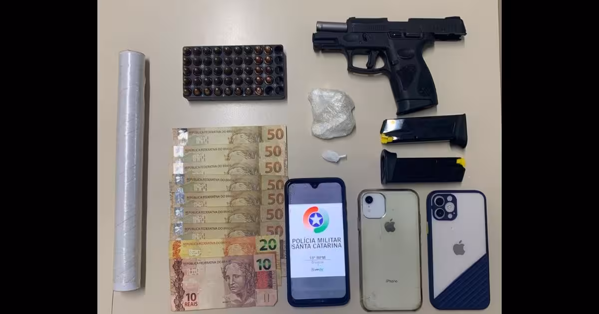 Com autorização dos envolvidos, os policiais deslocaram até ao endereço do casal e, em buscas, encontraram uma pistola calibre 9mm com três carregadores e 44 munições intactas, além de papel filme, utilizado para embalar entorpecentes. O casal foi preso.