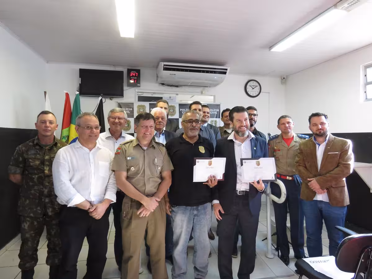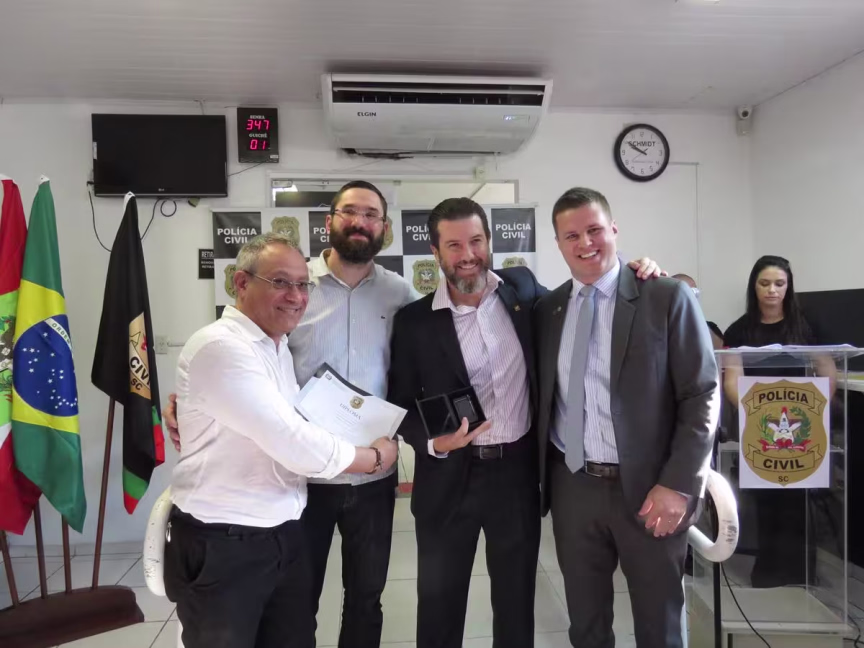 O presidente da Associação Empresarial de Brusque (Acibr), Halisson Habitzreuter, recebeu a homenagem de Amigo da Polícia Civil. Fernando de Faveri diz que o nome dele foi unanimidade entre os delegados pelo empenho dele para a melhora na segurança.