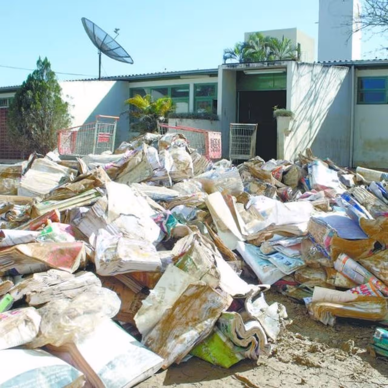No pátio, o lodo dividiu a cena com as pilhas de entulhos que cresciam a cada passo da hora. Lá, o que não era lama, virou pó: o pátio da entrada principal, as pilhas de livros desfolhados ao sol, salas de aula, corredores, paredes, móveis.