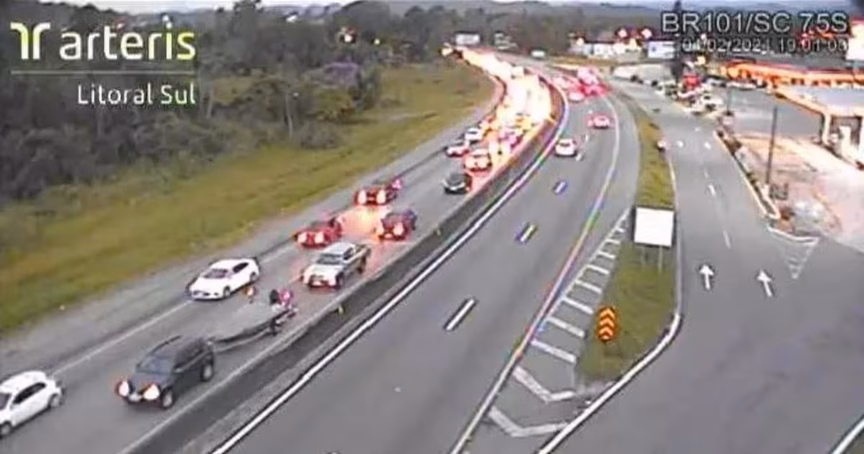 Uma colisão fatal na BR-101, em Araquari, gerou bloqueios e congestionamento de dez quilômetros (km) no final da tarde deste domingo, 4. Um ciclista e uma motociclista morreram no local.