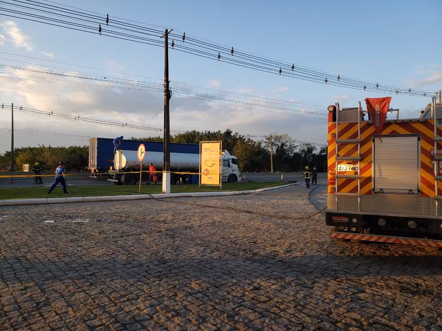 Colisão entre caminhões causa vazamento de combustível na rodovia Antônio Heil