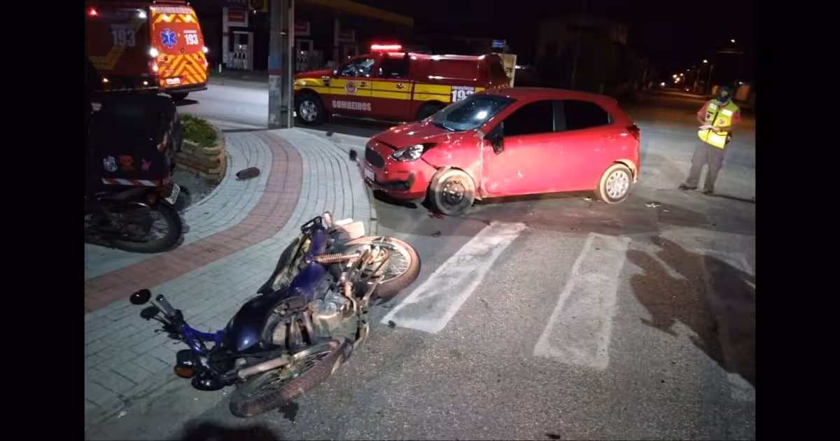 A colisão envolveu um automóvel Ford Ka, de cor vermelha e uma motocicleta Honda CG Titan, com placas de Brusque.