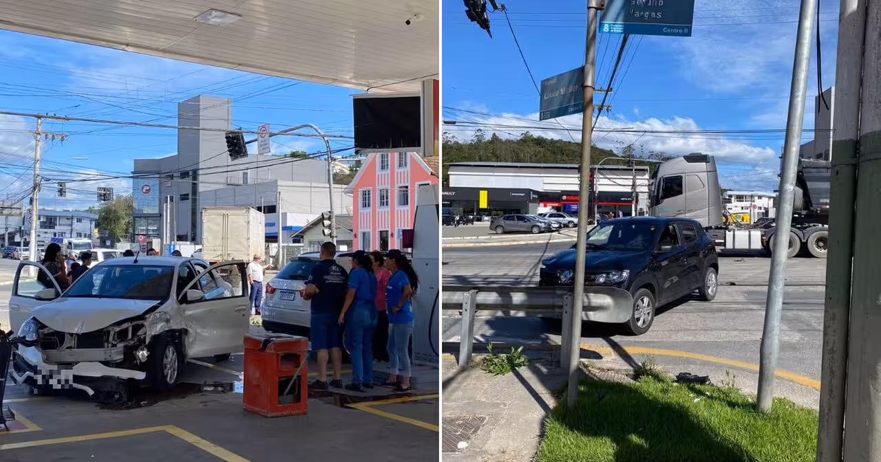 Um acidente entre dois carros foi registrado em frente ao posto Shell (Mime), localizado na esquina da avenida Lauro Muller, no Centro de Brusque. Segundo informações preliminares, a colisão aconteceu por volta das 14h40 e não deixou feridos.