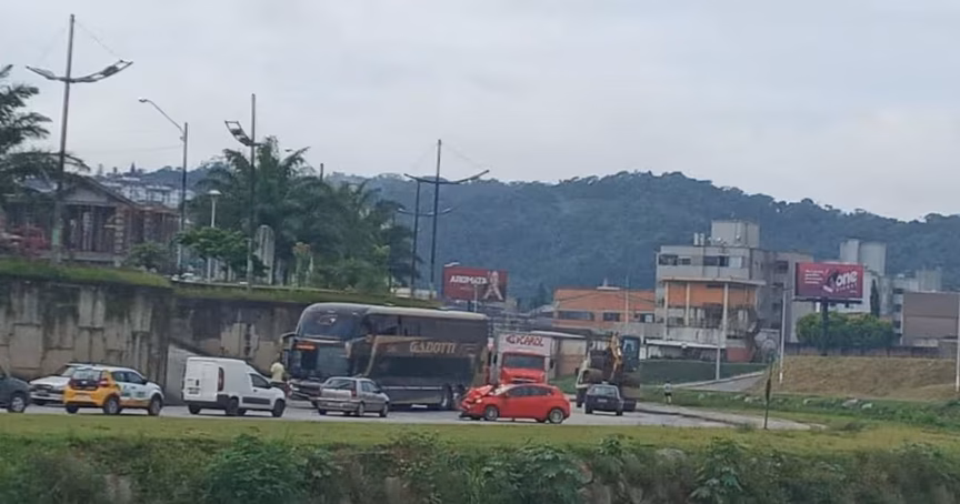 Colisão entre ônibus de turismo e carro deixa trânsito lento na avenida Beira Rio, em Brusque