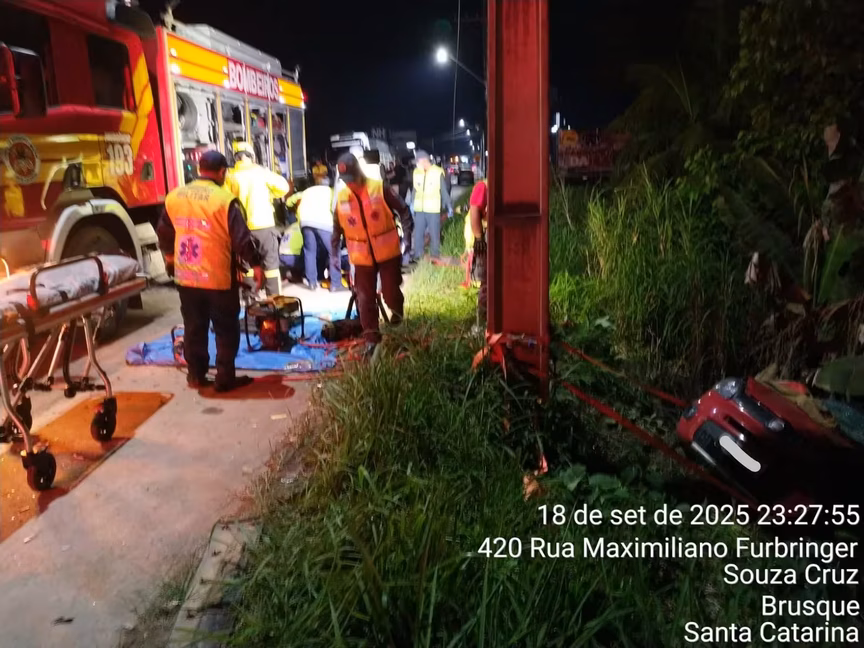 O Corpo de Bombeiros divulgou novas informações sobre o carro que caiu em uma ribanceira em Brusque, na noite da quinta-feira, 18. Segundo o relatório oficial, o acidente envolveu três veículos e deixou duas pessoas feridas. O caso aconteceu por volta das 22h45, na rua Maximiliano Furbringer, no bairro Souza Cruz.
