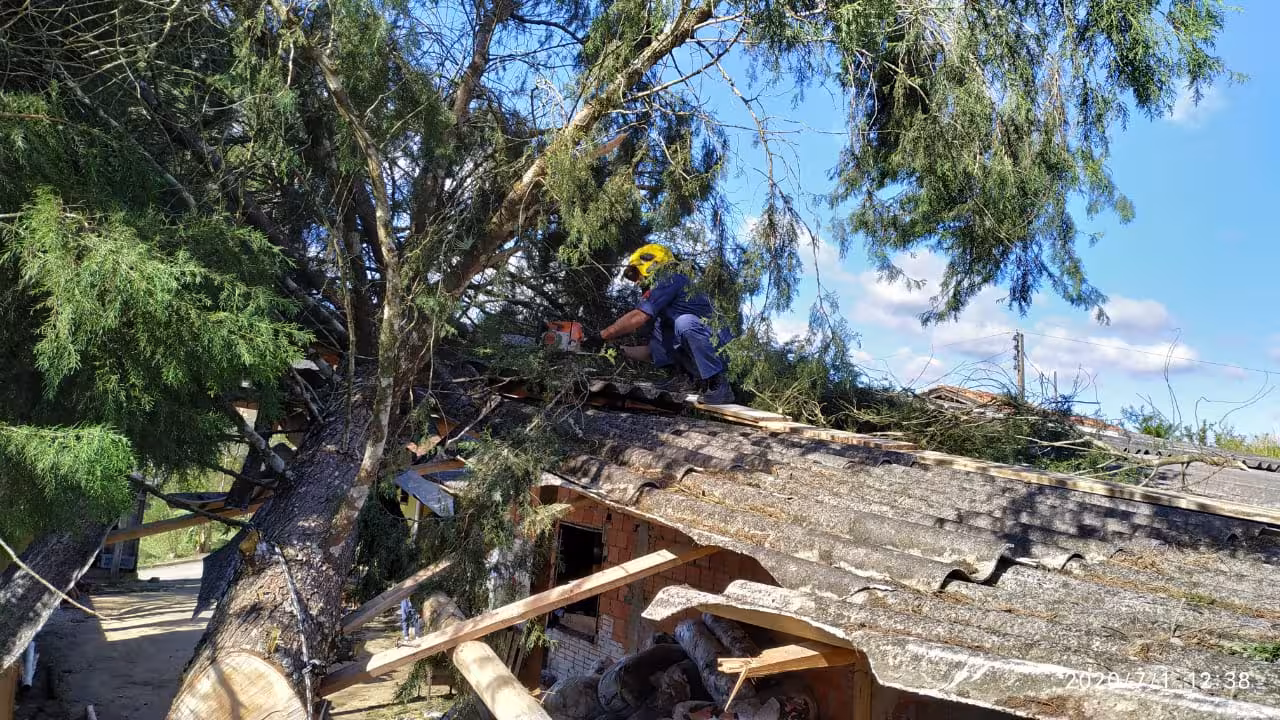 A equipe de socorro foi acionada por volta das 11h. Ao chegarem no local, os bombeiros encontraram a árvore de grande porte sobre galpão ao lado de uma residência. Ninguém ficou ferido.