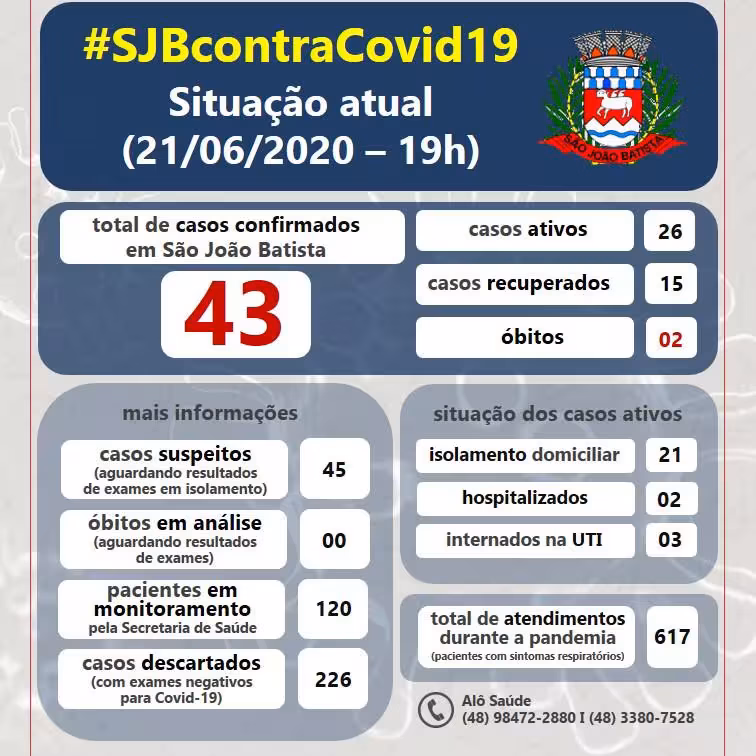 Com isso, São João Batista contabiliza, no momento, 26 casos ativos da doença. Destes, 21 estão em tratamento domiciliar, dois internados em leitos hospitalares de média complexidade e três na UTI.