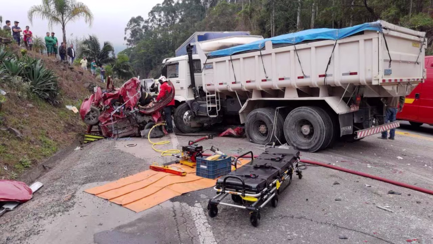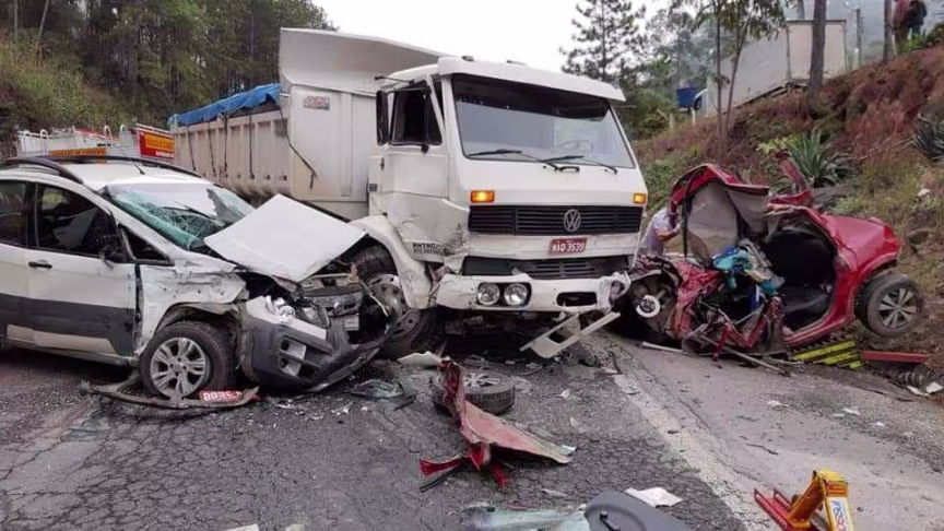 O motorista de uma caçamba que descia a serra perdeu o controle na curva, invadiu a pista contrária e colidiu em oito veículos.