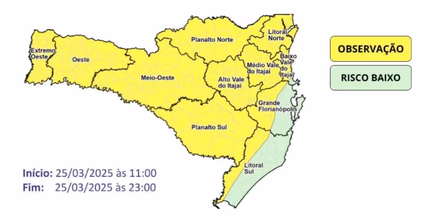 A Defesa Civil emitiu um alerta para a possibilidade de temporais e chuva intensa nesta terça-feira, 25, na região do Vale do Itajaí, onde Brusque está localizada. A região permanece em alerta amarelo até às 23h.