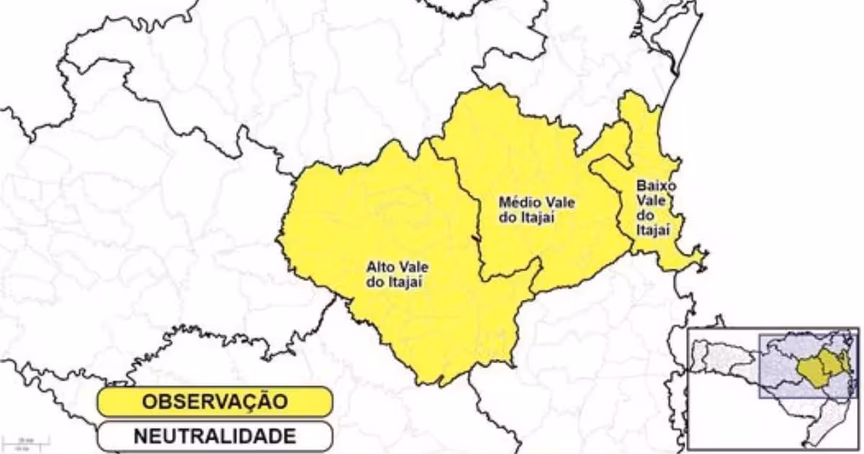 A Defesa Civil de Santa Catarina divulgou na manhã desta quarta-feira, 4, por volta das 7h, que o estado das regiões do Vale do Itajaí para chuvas é de observação.