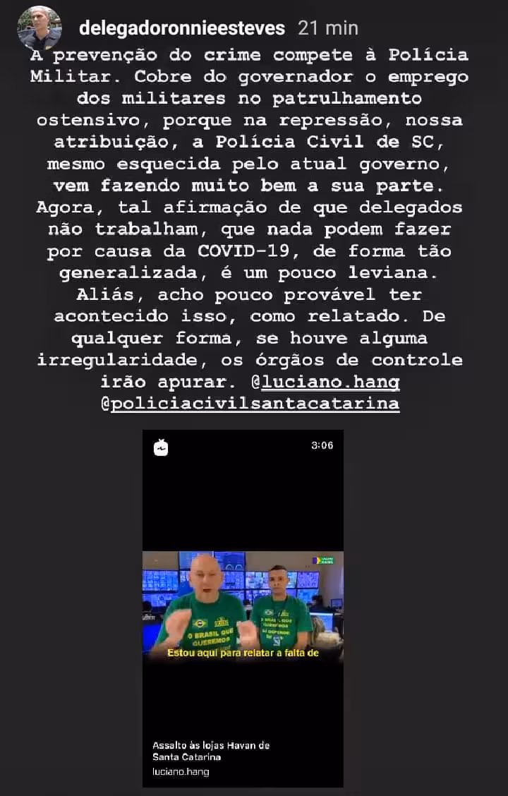 O delegado Ronnie Esteves também escreve na sua postagem, que a Polícia Civil de SC está esquecida pelo atual governo e que a afirmação de Hang, de que delegados não trabalham, que nada podem fazer por causa da Covid-19, de forma tão generalizada, é leviana. Ele informa que acha pouco provável ter acontecido o que Luciano Hang relatou no vídeo, mas de qualquer forma, se houve alguma irregularidade, os órgãos de controle irão apurar.