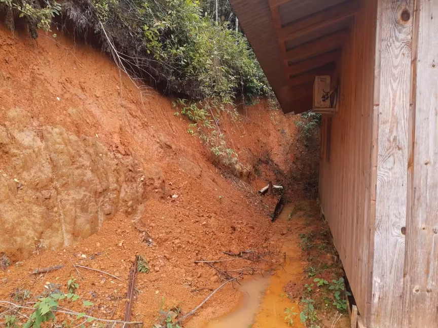 Devido a grande quantidade de chuva registrada no último dia, locais próximos da casa deslizaram. Com isso, cerca de um metro da residência ficou sem sustentação. O terreno segue molhado e há grande risco de que a construção caia.