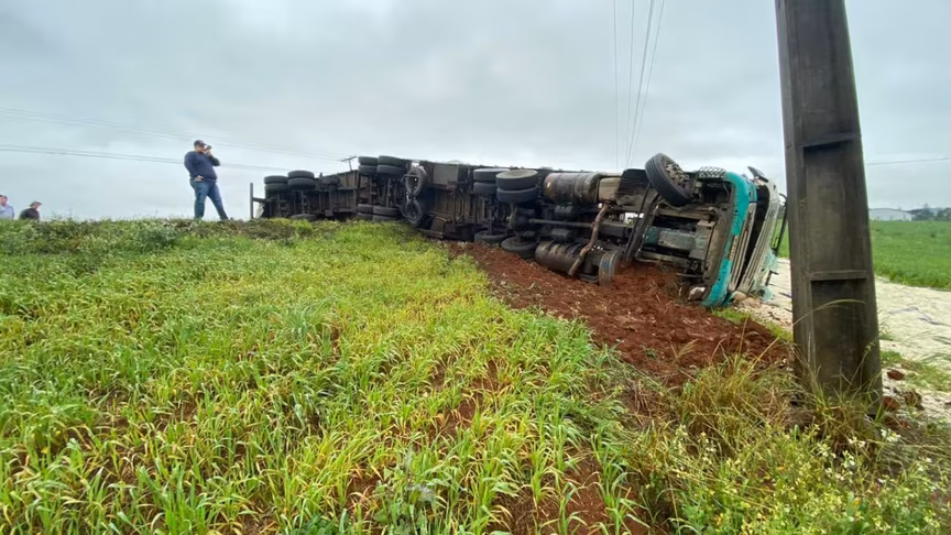 O veículo, que transportava arroz, tombou na via e causou a interdição total do trecho. O motorista da carreta, de 57 anos, saiu pelo para-brisa antes dos bombeiros chegarem.