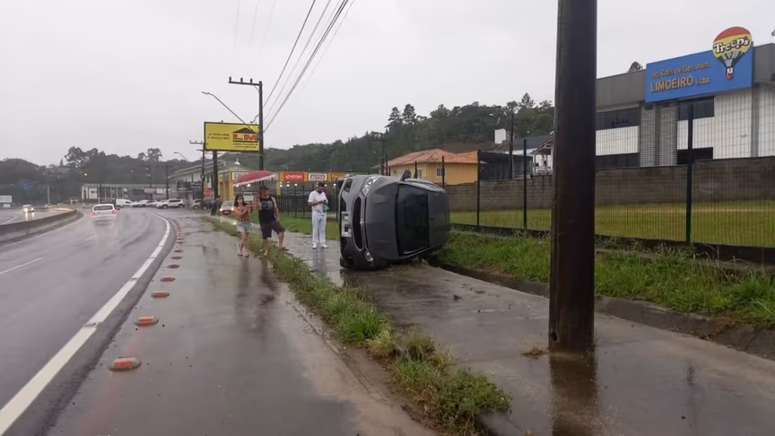 Um deles ocorreu na rodovia Antônio Heil, no bairro Limoeiro. Segundo informações de testemunhas, o condutor perdeu o controle após passar em uma poça de água, bateu em um canteiro e capotou.