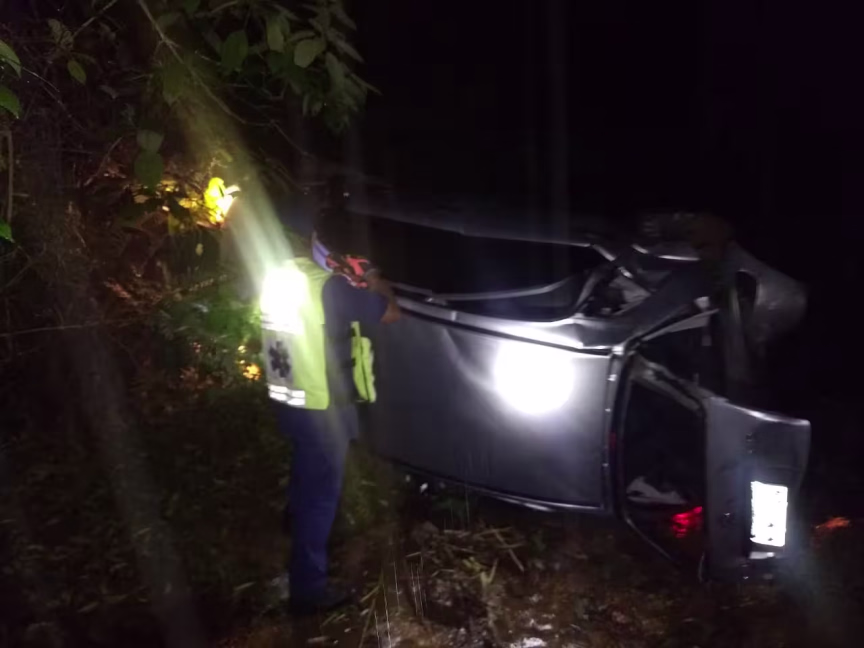 Na madrugada deste domingo, 15, por volta da 1h, um carro Citroen C3 prata, com placas de Brusque, capotou e em seguida caiu em ribeirão, na rua Monsenhor Valentim, no bairro Zantão.