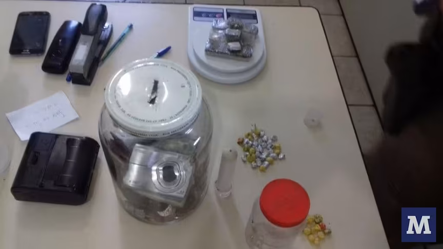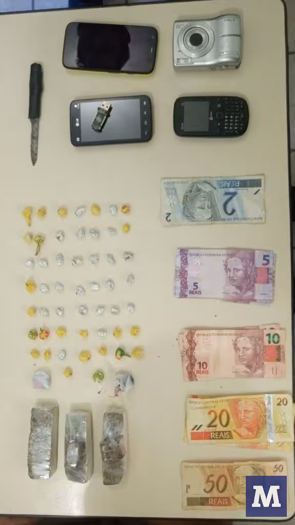 Dentro da casa, os policiais apreenderam também mais dois papelotes de maconha, além de uma câmera fotográfica, três celulares, um pendrive, uma faca, R$ 176,50 em moedas e R$ 132 em espécie.
