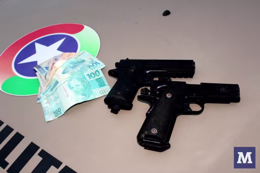 Os dois presos foram entregues na Delegacia de Polícia Civil, assim como o dinheiro e as armas de brinquedo apreendidas. A motocicleta foi recolhida ao pátio para posteriormente ser entregue ao proprietário.