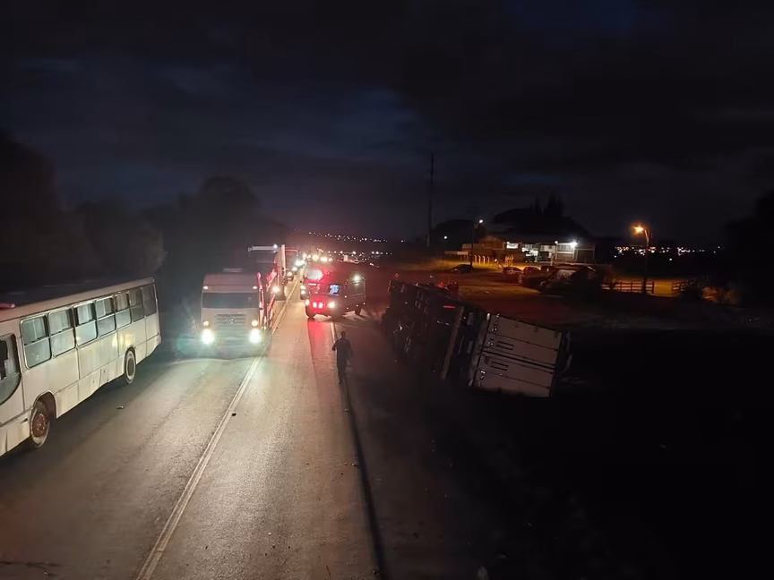 Após a chegada do Corpo de Bombeiros no local, as equipies constataram que o veículo, Scania branco, conduzido por um homem de 39 anos, perdeu o controle e acabou tombando, ficando lateralizado (lado do carona) no acostamento.