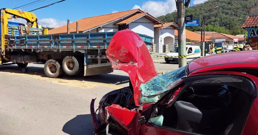 Duas pessoas ficam feridas após carro colidir contra caminhão no Guarani, em Brusque