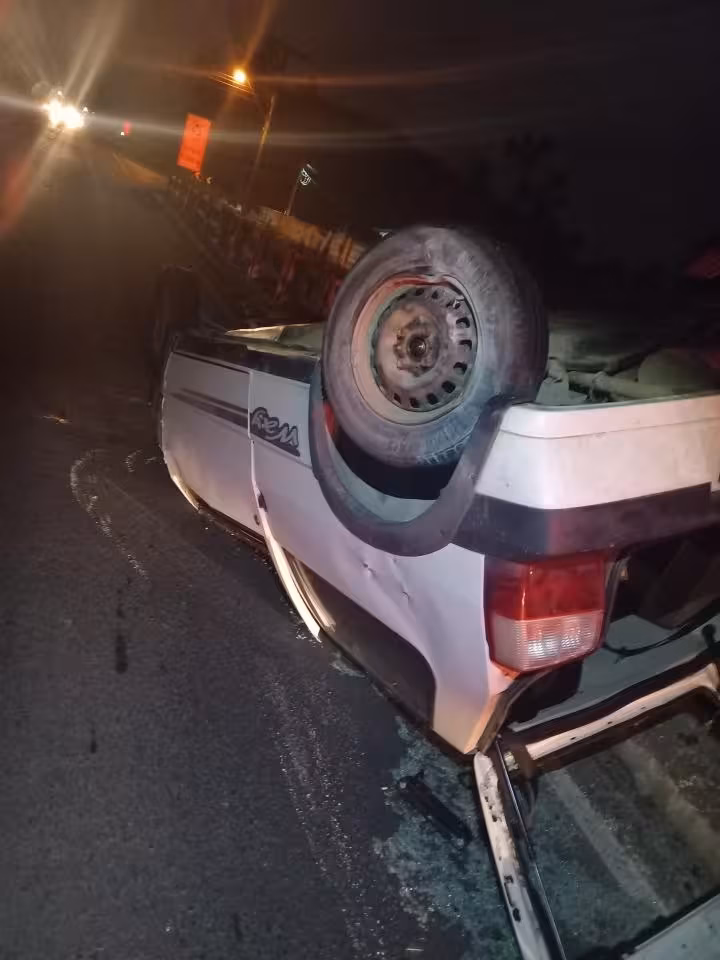Após a colisão, o carro Fiat Uno chegou a capotar na via. Motorista e pedestre foram conduzidos pelo Corpo de Bombeiros para atendimento médico por apresentarem lesões graves.