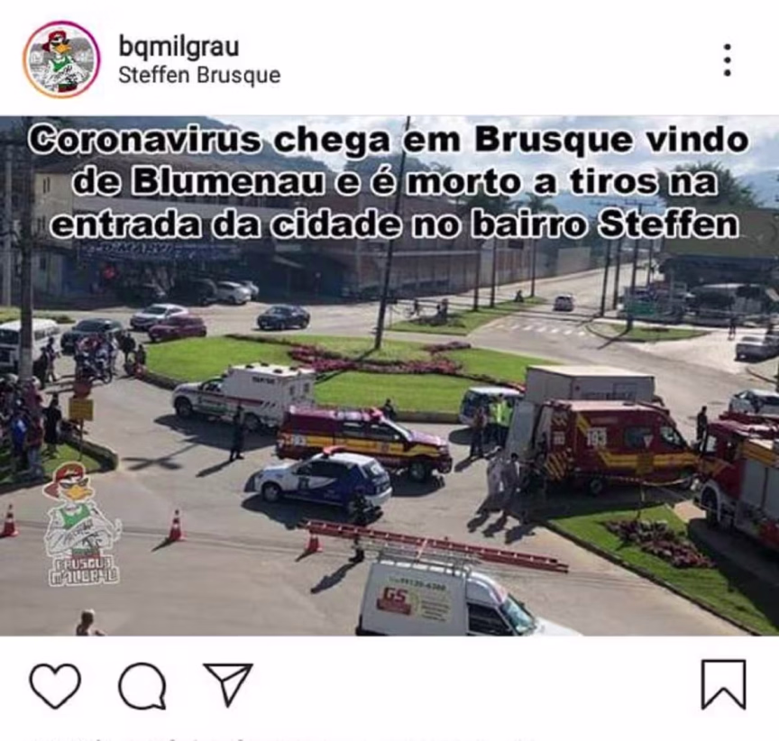 Neste domingo, 8, a página Brusque Mil Grau publicou nas redes sociais Facebook e Twitter uma postagem sobre a possível chegada do coronavírus em Brusque utilizando a foto de um acidente na rotatória do bairro Steffen que resultou na morte de Damares Ribeiro, de 25 anos, no dia 8 de outubro de 2019.