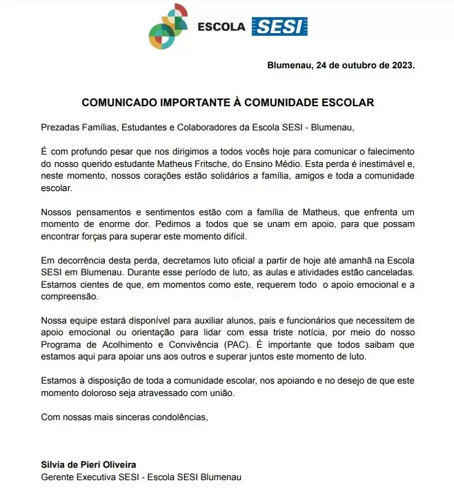 Informações sobre o velório de Matheus Fritsche ainda não foram divulgadas.