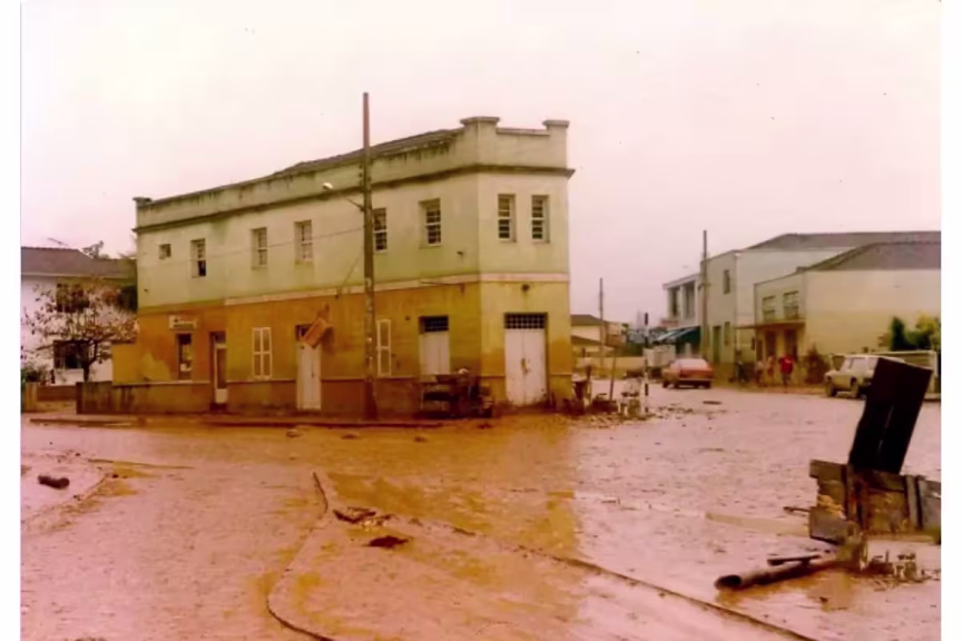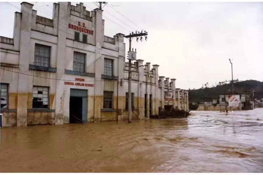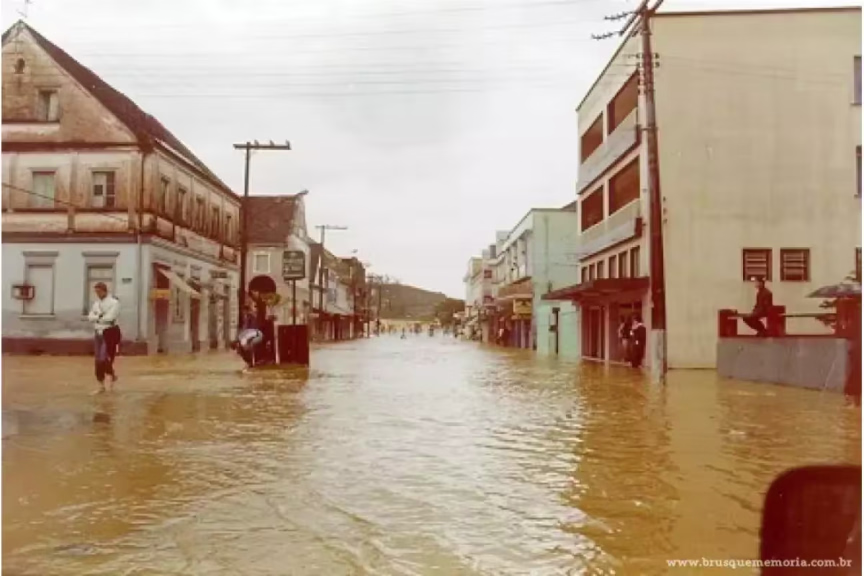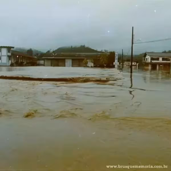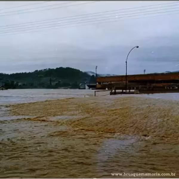 A seguir, apresentamos uma comparação fotográfica dos mesmos locais durante a trágica enchente de agosto de 1984 e as imagens atuais de Brusque.