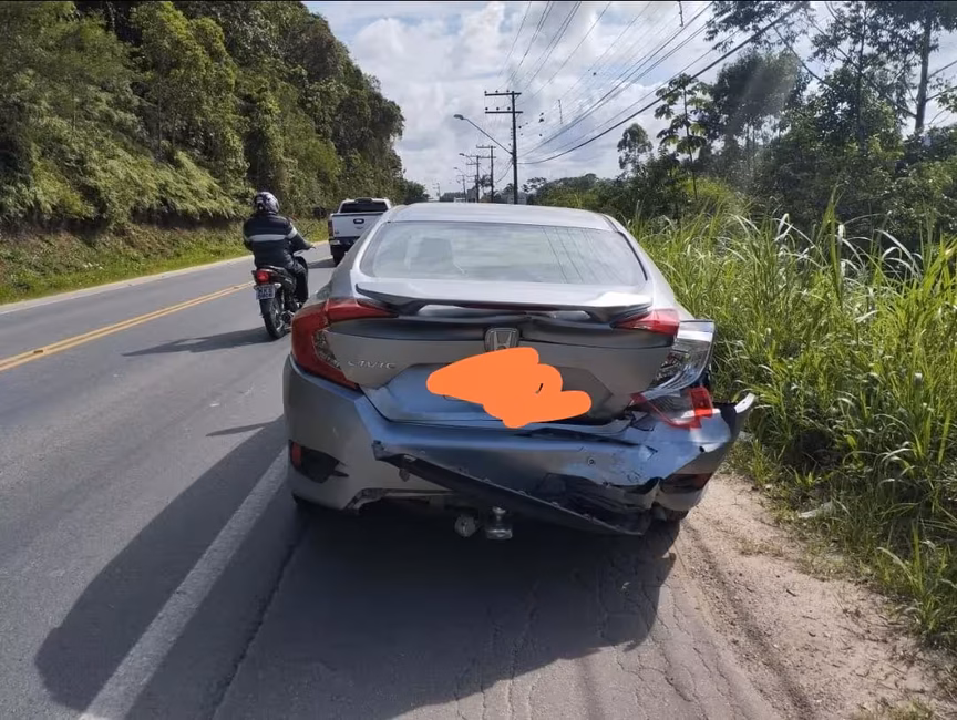 V-2: Honda Civic ELX CVT, de Brusque – Condutor: homem, 50 anos. Danos: parachoque traseiro, tampa do porta malas;
