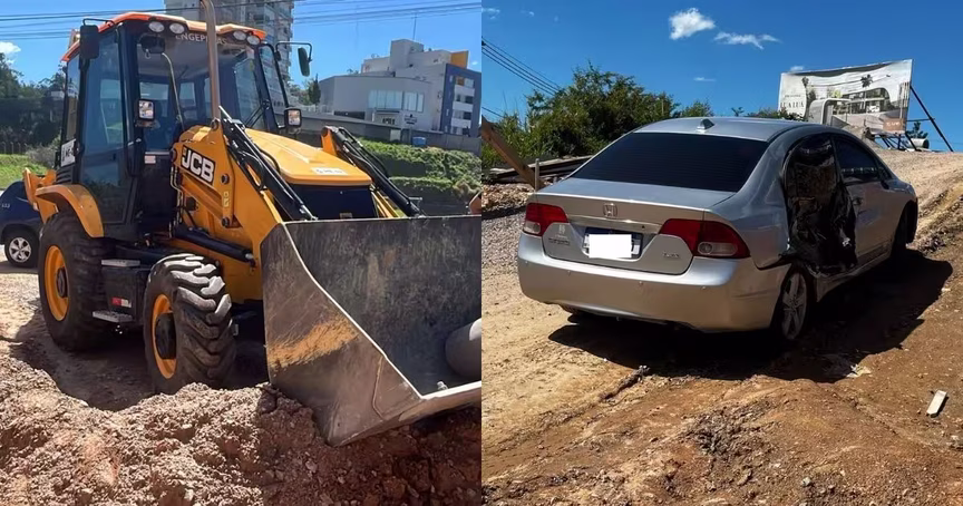 Uma retroescavadeira colidiu com um Honda Civic na rua Ivandro Bruns, em Brusque, na tarde desta quinta-feira, 11.