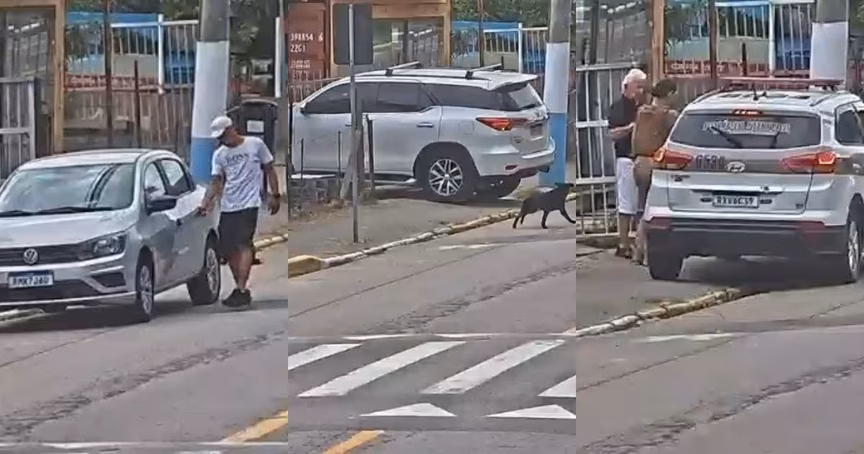 Em determinado momento, o criminoso de camiseta branca abre o portão novamente. Nesse momento, um Volkswagen Voyage estaciona em frente à loja. O motorista, um homem mais velho, também vítima do assalto, tranca o carro antes de sair.