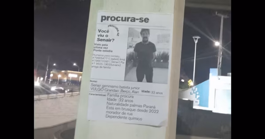 A família de Senair Geniniamo Batista Junior, de 32 anos, espalhou panfletos em alguns pontos de Brusque para tentar encontrar o homem que está desaparecido desde setembro de 2022.