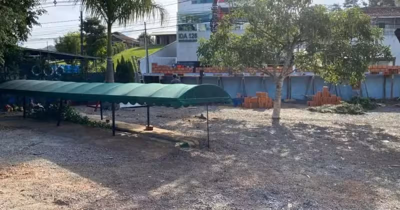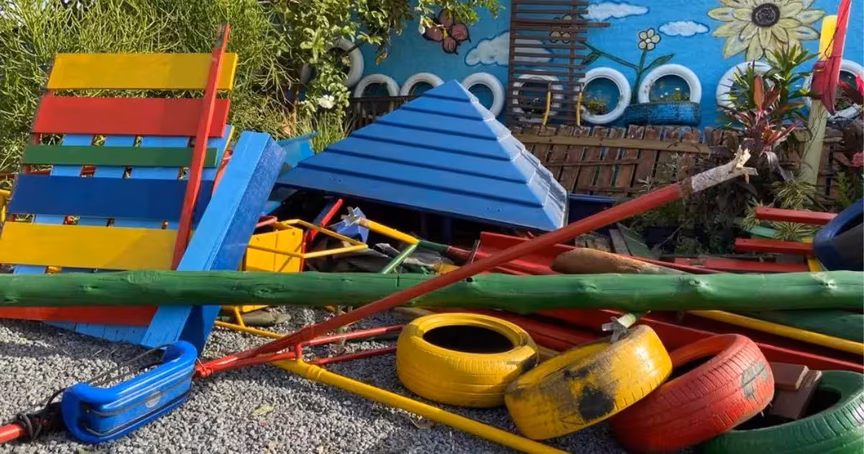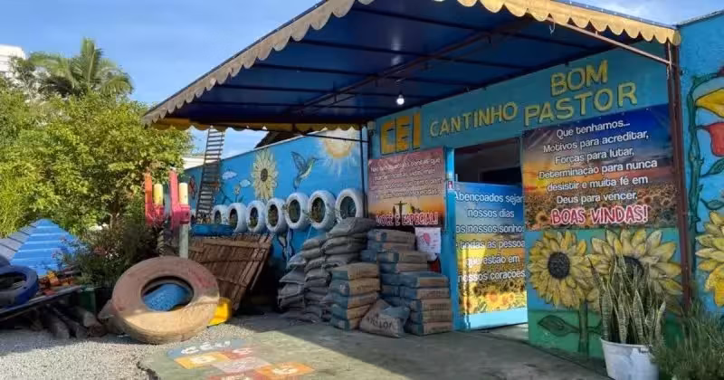 O novo parquinho, tijolos, sacos de cimento, cal, areia, brita e até fiação elétrica foram doações da comunidade. Policiais seguem presentes no espaço para garantir a segurança das crianças que precisam do espaço do CEI.