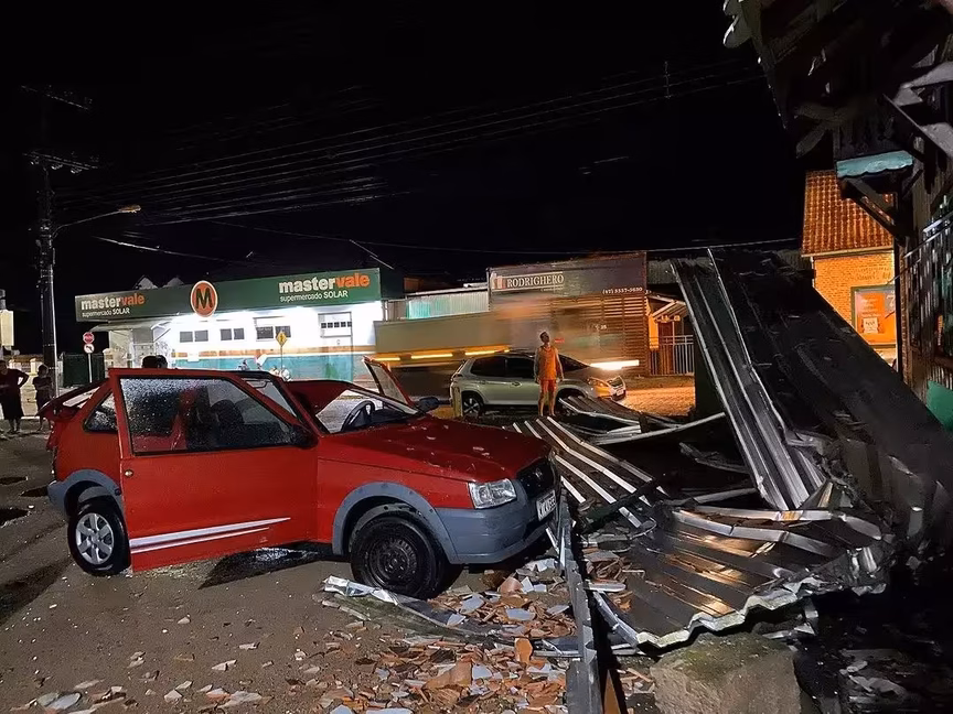 Um carro também foi atingido por telhas e quase deixou uma mulher ferida.