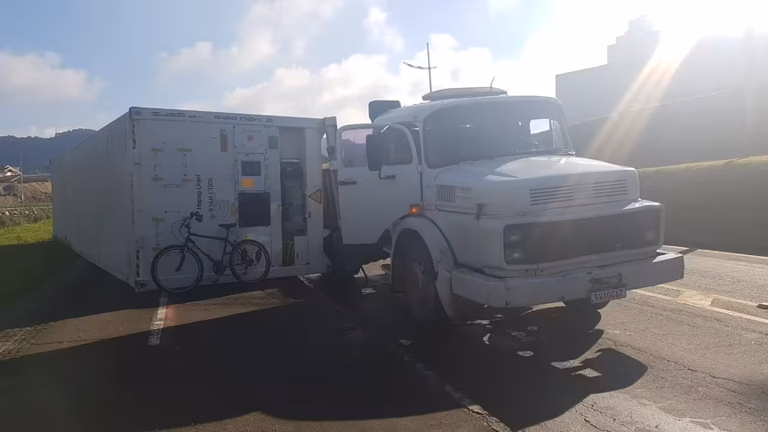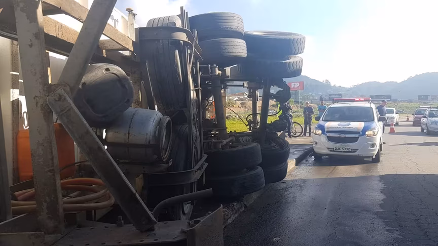 Um caminhão tombou na avenida Beira Rio na manhã desta terça-feira, 20, em Brusque. O acidente ocorreu na margem direita, perto da ponte do Trabalhador, na altura do bairro Santa Rita.