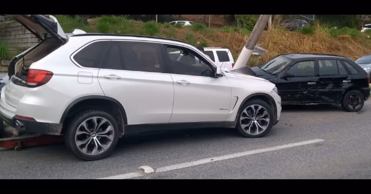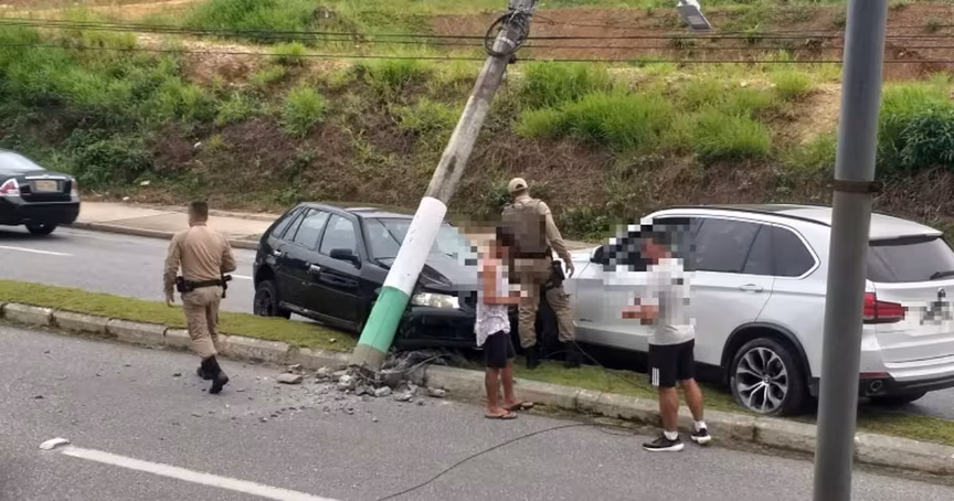 De acordo com a Guarda de Trânsito de Brusque, o acidente envolveu um Volkswagen Gol de cor preta, um BMW de cor branca e um poste.
