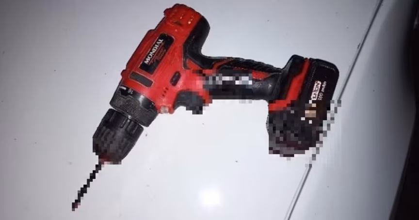 A furadeira utilizada pelo autor para machucar a vítima foi localizada pelos policiais. De acordo com o relatório da PM, além de estar sujo de sangue, o equipamento tinha resquício de tecido de pele na broca.