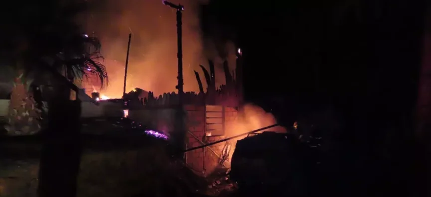 A casa, com paredes de madeira, foi tomada pelo incêndio. Conforme o Corpo de Bombeiros, a residência tinha 60 metros quadrados e foi completamente tomada pelas chamas. Um veículo Ford Versailles, que estava estacionado ao lado da edificação, também foi consumido pelo fogo.